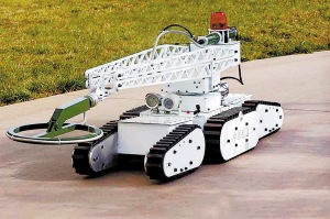 【专家解读】该机器人用一台笔记本电脑控制,操作简单,有4个特点:具有三节履带式结构,前后节均可以俯仰,在复杂的地理环境中能灵活机动;体积较小,可进入狭小空间作业,侦察时具有很强的隐蔽性;采用模块化结构,各模块独立运作,可拆换性强;利用高精度数字平台,实现探雷器在三维空间内准确定位,能精确标定可疑物体。