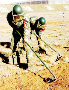 在一片刚爆破的雷区中,作业手发现还有残余未爆的地雷。“人工排除!”随着指挥员一声令下,数名作业手操起“多功能扫雷耙”,在爆破过的地方轻轻钩刨,模拟地雷像红薯、土豆一样骨碌碌滚出来。很快,10余平方米的雷区被清除干净。