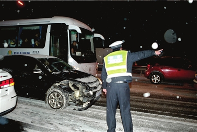 昨天,(北京)市交管局于清晨6点和晚高峰时分别启动三级雪天疏导方案,加派3000名警力上路维护疏导。由于路面湿滑车速变慢,事故有所增多,傍晚雪情使晚高峰时间有所延长。昨晚8点开始,京津塘、京津第二高速、京沈高速先后被封闭。