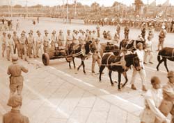 他说,当时炮兵方队是第四个通过天安门广场的队伍,以轻迫击炮、重迫击炮、战防炮、山炮和野炮、榴弹炮、高射炮等7种上百门火炮阵容出现。火炮由小到大,由低到高,依次前进,有的火炮是用骡马拽着通过天安门的。