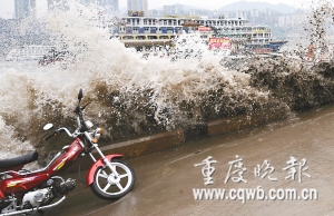 昨下午2时,朝天门六码头,岸边玩耍的市民突然遭遇两米多高的巨浪袭击。因躲闪不及,好几位市民湿身。正在浮船上作业的水手也随浮船被巨浪抬起半米多高,浮船险些失控。