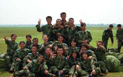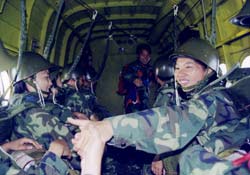 女伞兵陈思维谈起入伍后学跳伞的经历,诸多困难及数次遇险的情景至今仍记忆犹新。她说,我们刚到女子空降队时,对蓝天充满了向往,渴望同男兵一样驾驭伞花遨游蓝天。可不曾想,通往蓝天的路竟然那样的艰辛和漫长。按要求,队员们每年的跳伞训练任务是每人80至100次,而每个跳伞日至少要跳3次伞,这对体能消耗相当大。每天,我们要跑两个5公里,做100个俯卧撑、100个仰卧起坐、100次高抬腿,训练强度可想而知。跳伞训练首先从地面训练开始,主要是练习空中跳伞的离和着陆动作。训练场上,教员一声令,大家就迅速地将两腿分开,间隔20厘米,身体斜60度,全身紧缩一团,双手抱在胸前。一般人3分钟左右便大汗淋漓,10分钟左右,身体虚弱的甚至昏倒。而教员们为了让队员练就良好的离机姿势,一声口令,女伞兵们弯腰、收腹、屈膝,一做就是十几分钟,让身体几乎凝成一尊雕塑。当教员喊“跳”的口令时,大家便从1.5米高的平台上跳下来。女队员们每天爬上跳下不下百次。在不断的“跳、跳、跳”中,很多同志的腿都肿了,吃饭时,扶着桌子才能坐下去,吃完饭,靠人拉一把才能站起来,走路时腿不听指挥,下坡得侧着身子小心翼翼。就是这样,通过日复一日的刻苦训练,每个女队员的胆气越来越壮,动作越来越协调。