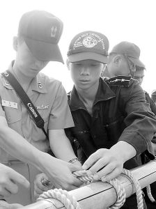 刘大鹏别出心裁,按教员教的方法撇完缆后,开始演示中国的撇缆方法。只见他先将缆绳放出2米多,通过腕力让撇缆头在头顶上方旋转,“嗖”的一声抛出,撇缆头准确地落入目标区域内。