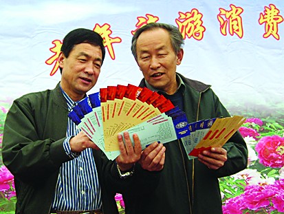 3月21日,菏泽市老龄办、市旅游局和菏泽康辉旅行社联手向菏泽市55岁至70岁的老人首次发放价值140万元的旅游消费券,可惠及菏泽市2万名老人。本次老年旅游消费券分为20元与50元面值,菏泽市计划发放2万套,价值140万元。