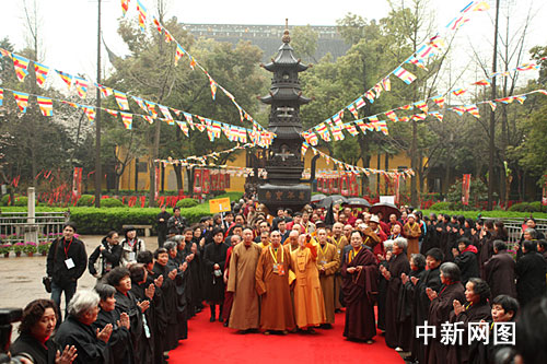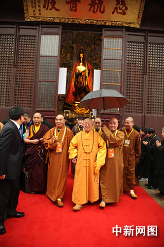 中新网3月28日电 参加第二届世界佛教论坛的其中四百五十位高僧于二十七日参观著名的江南四大名刹江苏常州天宁禅寺,在高一百五十三点七九米有着中华第一佛塔之称的天宁宝塔前,近千位身穿素服的居士在细雨中等待着高僧。(孔建钟 李建军)