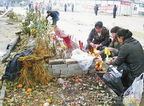 冯慧和她的姐姐、侄女,在“三道拐”处摆上水果、酒等祭品,为她们在地震中遇难的5位亲人祈祷。