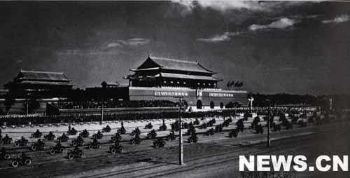 中华人民共和国成立第四周年国庆节庆祝典礼,今天在首都天安门广场隆重举行。中央人民政府毛泽东主席,今天检阅了保卫祖国和平建设的武装部队,和首都四十余万从事和平建设的各界人民的游行队伍。