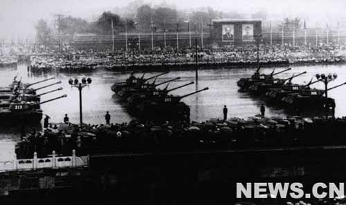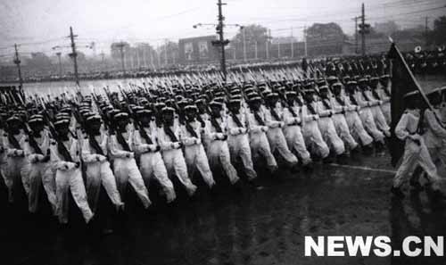 接着,分列式开始。军事学院、步兵学校、炮兵学校、工程兵学校、坦克学校、航空学校、海军学校的队伍和水兵、公安军、步兵师、摩托化步兵、伞兵、炮兵部队、坦克部队相继通过了天安门广场。