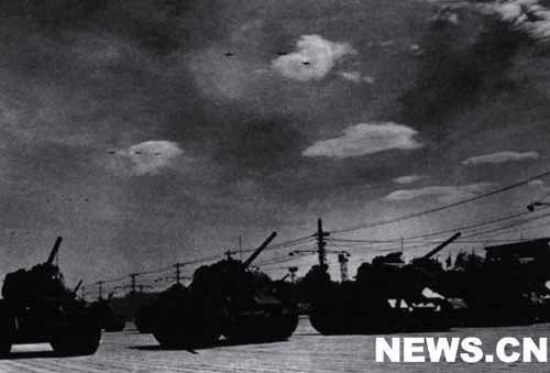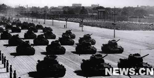 接着,受阅部队开始分列式。军事学院的队伍迈开整齐的步伐首先走进天安门广场。紧跟在他们后面的是步兵学校、炮兵学校、工程兵学校、坦克学校、航空学校、海军学校和水兵、公安军、步兵、摩托化步兵、伞兵的队伍。随后,装备着各种大口径远射程大炮的炮兵部队和威力强大的坦克部队相继通过了广场。当坦克部队在天安门广场出现时,一队队喷气式轰炸机和歼击机风驰电掣地飞过天安门上空。