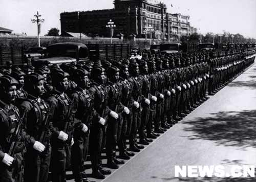 我们伟大祖国万里海疆的保卫者--海军军官和水兵们列队通过天安门广场。他们当中,有击沉、击伤敌舰船一百多艘、俘获五十艘的东海舰队水兵;还有来自福建前线的水兵,他们在去年秋天的两个月里,曾把二十多艘蒋军舰艇埋葬在台湾海峡。我们祖国"有海无防"的时代一去不复返了。人民海军已经是一支拥有大量水面舰艇、水下潜艇和海军航空兵、海岸炮兵等各兵种组成的坚强的海防力量。