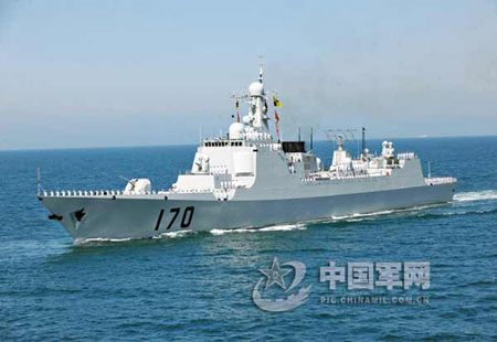参加海上阅兵的新一代国产驱逐舰中,“兰州”号导弹驱逐舰备受世人瞩目。该舰舷号170,是中国目前最新型的导弹驱逐舰,在网上被誉为“中华神盾”。该舰2001年8月在上海江南造船厂开工建造,2003年4月下水,2005年8月出厂,2005年9月正式命名加入人民海军序列。