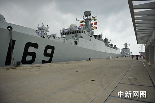 当天上午九时许,创造中国海军多项历史、功勋卓著的“武汉”号、“海口”号导弹驱逐舰缓缓驶入 三亚某军港码头,受到岸上社会各界的热烈欢迎。