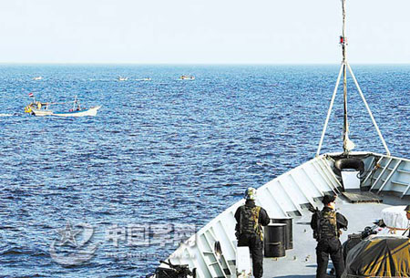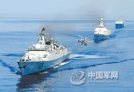 2008年12月26日,由南海舰队3艘现代化战舰组成的中国海军首批赴亚丁湾、索马里海域护航编队,满载着13亿中国人民的深情关注,犁开了人民海军远洋护航的新航迹,开启了中国海军走向深蓝的新征程,奏响了构建“和谐海洋”的新乐章。