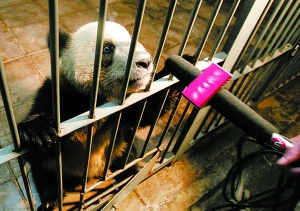 在曾有林验货时,饲养员杨海迪不失时机地给大熊猫们喂食矿泉水及苹果、胡萝卜等物。