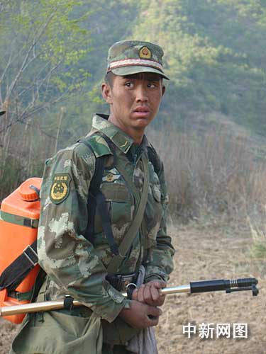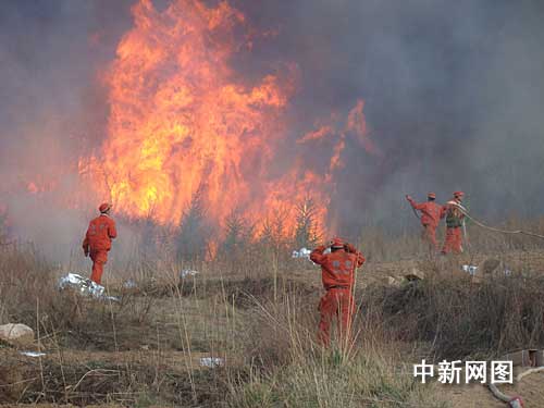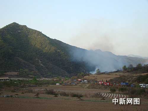 中新网5月2日电(增平)山西省交城县会立乡翟家庄村二十八日下午发生的森林火灾蔓延至今。今日上午,林区现场明火一度被扑灭。十二时左右,一阵大风中突然引起余火复燃,青羊沟村附近和后庄的森林山火情紧急,现场形势又显严峻。千余人又投入紧张的现场扑火行动中。