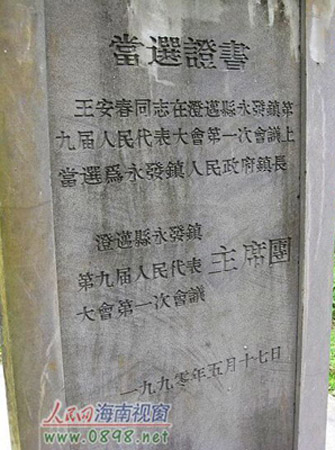 采访中,记者联系遵谭镇委核实王安春的身份。遵谭镇委办公室的负责人告诉记者,王安春确实在澄迈永发镇当过镇长,后来还在该县农业局就任副局长,在儒友村修造的活人墓,正是王安春所为。