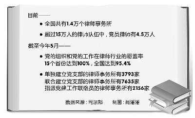 当前律师行业党建工作面临着良好的发展机遇,中央高度重视、亲切关怀,中央组织部对律师行业党建工作给予有力的指导和支持,司法部党组和吴爱英部长提出了明确的工作要求,各地党的组织部门和司法行政部门共同推动形成了律师行业党建工作的新局面。下一步,在努力推动实现党的组织和党的工作在律师行业全覆盖的同时,我们将结合律师行业特点,积极探索律师行业党组织和律师党员发挥作用的有效途径,增强党对律师行业的影响力和对律师的凝聚力。