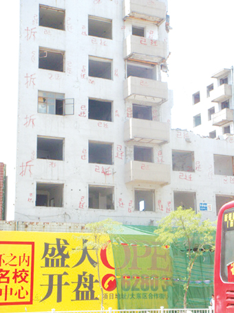 另外,孙律师还说:“自2005年1月1日起施行的《沈阳市城市市容和环境卫生管理条例》第二十六条规定‘禁止在建筑物、构筑物、树木、公共场所、公用设施、住宅楼涂写、刻画和张贴小招贴等宣传品。’同时该条例第五十四条还规定,违反本条例第二十六条的规定,由市容环境卫生行政主管部门责令其纠正违法行为,采取补救措施,并对在建筑物、构筑物、树木、公共场所、公用设施、住宅楼涂写、刻画和擅自张贴小招贴等宣传品的,处100元罚款;对未经批准擅自张挂、张贴宣传品的,处500元以上1000元以下罚款。因此,从这一地方法规的规定来看,涂写‘拆’字的行为者也应受到处罚。”