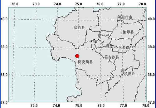据测定,此次地震震中位于北纬 38.7°, 东经 74.9°。目前还没有人员伤亡和财产损失的报告。