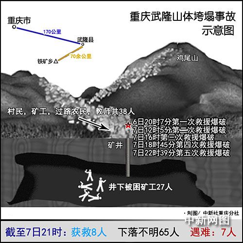 5日下午3时发生的重庆市武隆县铁矿乡鸡尾山山体垮塌灾害,直接导致山对面的三联采矿场和几所民居及一些路人被埋。经过两天两夜的搜救工作,截至7日23时,救援人员已发现7位遇难者遗体。包括此前救出的8名伤者和证实2名失踪者当时不在事故现场外,尚有65人下落不明,其中,被埋井下有矿工27人。