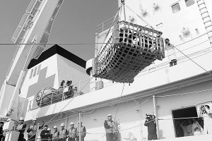 橘红色的大吊篮缓缓落下,4名重伤病员被并排、分层放入吊篮,转移至医疗艇。其他伤情较轻的伤员,有的用担架进行换乘转移,有的在医护人员的搀扶下转移。短短15分钟,30名伤病员安全转移至医疗艇,紧急后送后方医院……