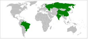 “金砖四国”(BRIC)包括巴西、俄罗斯、印度和中国。BRIC恰好是上述四国英文名称首字母缩写,因其发音类似“砖块”一词,故得名“金砖四国”。