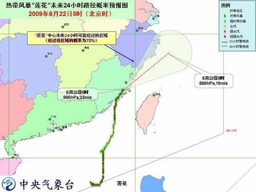 中新网6月22日电 中央气象台今天早晨六时发布台风消息:今年第3号热带风暴“莲花”(LINFA)已于昨天晚上8时30分前后在福建晋江东石镇登陆,登陆时中心附近最大风力有9级(23米/秒)。“莲花”登陆后向北偏东方向移动。今天早上5时风暴中心位于福建省莆田市境内,就是北纬25.5度,东经119.1度,中心附近最大风力有9级(23米/秒)。