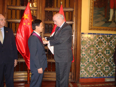 中新网6月23日电 据中国外交部网站消息,6月22日,秘鲁外长加西亚向即将离任的中国驻秘鲁大使高正月授予秘鲁太阳大十字级勋章。我馆政务参赞虞越、秘第一副总统詹彼得里、外贸旅游部长阿劳斯、部分政界高官、国会议员、驻秘使团代表、企业界等各界友好人士等50多人出席。