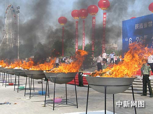 中新网西安6月26日电(记者 冽玮)6月26日是第22个国际禁毒日,今年的主题是“依法禁毒 构建和谐”。今天上午,陕西省禁毒委在咸阳市统一广场公开集中销毁缴获的313公斤毒品。