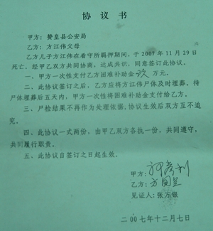 7月1日本报(燕赵都市报)刊发的《疑犯被逼喝凉水致终身残疾》如一石击水,让"牢头狱霸"、"躲猫猫"、"喝凉水"再次成为社会关注的焦点。而令人震惊的是,在调查秦英伟"喝凉水"致残案过程中,本报记者又有惊人发现:同是赞皇县看守所,2007年4月至11月半年多时间内,两个在押疑犯暴毙,最后都由当地公安部门出钱"协商解决",一位死者家属给了"困难补助金"9万元,另一位死者的家属给了1.5万元。