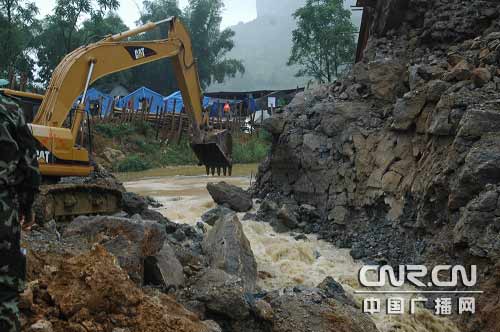 广西罗城卡马水库右坝首泄洪槽在今天7时和中午12时15分两次爆破之后,泄洪底口坚硬的混凝土护墙已被分解,但要过水还需加大开挖深度。13时,武警水电一总队开挖突击队在三支队支队长朱国良的带领下,冒雨展开反铲清碴突击战。经过5个小时的突击行动,水电官兵成功开挖出泄洪槽。