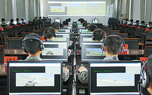 刚一进门,记者就听到枪炮声、战车轰鸣声交织在一起。百余名官兵头戴耳机端坐在电脑前紧张操控着鼠标和键盘,前方大屏幕上显示“红军”装甲战车正快速通过“蓝军”炮火拦阻区。