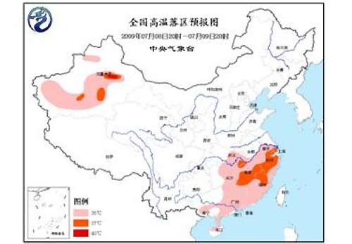 中新网7月8日电 中央气象台8日18时继续发布高温预报:预计,明天(9日)白天,新疆北疆南部和南疆盆地、湖北东部、江南大部、华南中东部等地有35℃ 以上的高温。