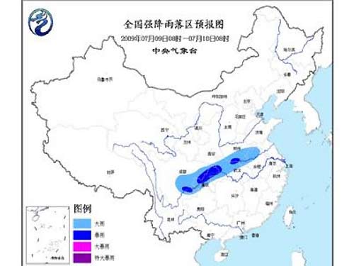 中新网7月9日电 中央气象台今日06时发布暴雨预报:预计,今天白天到夜间,川西高原东南部、四川盆地东部和南部、重庆西部和北部、湖北西北部、河南南部、安徽北部等地有大雨或暴雨。