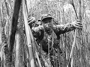 大家商议后决定按原先判定的方位沿山头方向走。“走山不走沟,走纵不走横”,是热带山岳丛林地行军防止迷路的一个方法。然而走了两个多小时后,小分队又一次迷失了方向。周团长和副团长周世纪开始在岩石上的青苔和大树的枝叶上作起了“文章”。
