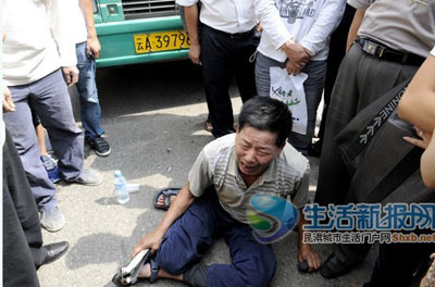 一名50多岁的男子挡在一辆77路公交车前,坐在地上痛哭,民警怎么劝说他也不愿意离开。男子称:“这些城管太不讲道理了,他们快把我的儿子打死了。”据该男子介绍,20多名城管人员昨日早上将其儿子打伤,儿子被送进医院抢救,而打人的城管全部跑了,“实在是没有办法,我儿子不能白白受罪,无奈之下,我只能通过这种方法引起相关部门的重视。”