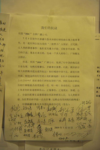 7月13日上午,当记者来到设在乌鲁木齐海德饭店的新闻中心时,这里的工作人员反映说,连日来他们不断接到当地市民打来的电话,反映西方媒体关于“7·5”事件的报道不但有失公充,而且无视基本事实,他们要求工作人员将他们的不满和抗议转告给相关的西方媒体记者。有些市民是直接将他们抗议信送到新闻中心,将其贴在那里。