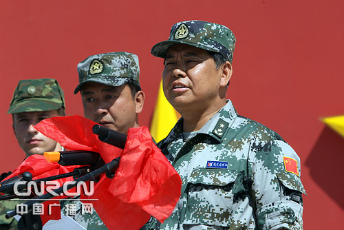 中方战役指挥部副总指挥、沈阳军区副司令员石香元中将致欢迎辞。(中广网记者陈欣 邱翔摄)