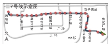 7号线全线23座车站,起于北京西客站,沿羊坊店南路向南至广安门外大街后转向东,沿广安门大街、广渠门大街向东至东四环,在化工二厂东侧转向南穿越化工路后,沿垡头西路向南至垡头南路再转向东进入玻璃二厂、染料厂等工业用地范围,线路沿规划道路向东南敷设,到达终点焦化厂站。(记者郭鲲)