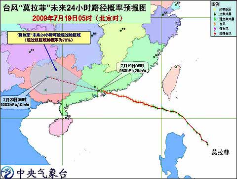 今年第6号台风“莫拉菲”(MOLAVE)的中心已于19日凌晨0时50分在广东省深圳市大鹏半岛沿海登陆,登陆时中心附近最大风力有13级(38米/秒),中心最低气压965百帕。登陆后,“莫拉菲”强度逐渐减弱,19日凌晨4时在深圳市境内减弱为强热带风暴,19日早晨5时,强风暴中心位于珠江口北部,就是北纬22.7度、东经113.7度,中心附近最大风力有10级(28米/秒)。