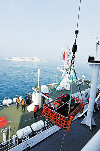 医院船用吊篮快速接受“伤员”。 王松岐、张群摄