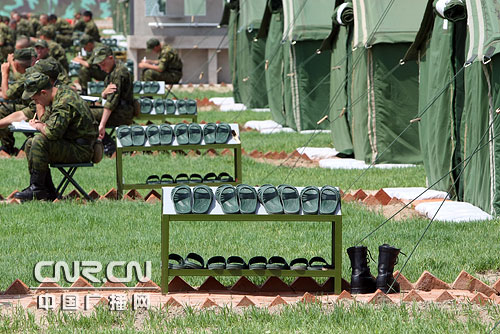 凤凰卫视记者:打靶归来,第一件事情当然是洗澡,不过这样赤条条穿过军营,在中国记者眼中实在是过于自由散漫,看来纪律严明的俄罗斯大兵,训练归训练,生活还是生活,由中方承建的俄军野营村,规模不大,但功能齐全,熨斗、网吧、电话亭,各种生活设施一应俱全,面积达2750平方米的大食堂,每天都为1300名俄罗斯官兵,提供最地道俄式餐饮,虽然食物原料由中国制造,但17位厨娘清一色都来自俄罗斯,超市内琳琅满目,应有尽有,每一份商品都用中文和俄文注明详细的价格,超市东西虽然便宜,还是要用人民币来购买,所以俄罗斯士兵大都要到这里的货币兑换处来把手中的卢布换成人民币,每100卢布,可以换19元人民币。兑换处经常大排长龙,但精通俄语的中方工作人员就说,开业一周以来,这里每天的交易额只是3万卢布,折合人民币6300元平均每人每天才兑换5块钱,不知道是俄军待遇差,还是俄罗斯经济衰退的缘故呢?