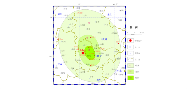 2. Ⅷ度区主要分布在姚安县境内,北自左门乡仰拉村以北,南到官屯乡巴拉扎,东起三渡邑、长寿村一带,西至官屯乡吊索箐,面积约230平方千米。
