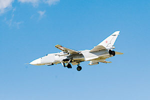 苏-24是苏霍伊设计局设计的第一种专门执行对地攻击任务的双座双发变后掠翼战斗轰炸机,北约称其为“击剑手”,于1974年开始服役。它具有高速突防能力和全天候作战能力,可对敌方500-1300公里纵深目标进行攻击,也可带小型核弹进行战术核轰炸。