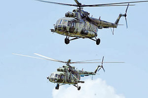 米-8是俄罗斯米里设计局的拳头产品,绰号“河马”。起名者大概只感到米-8样子丑、身躯笨拙,其实,飞上天的“河马”既威猛又灵活。两台涡轴发动机安装在机舱顶部,成为米-8直升机一大识别特征。