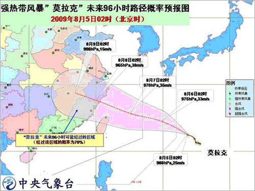 中新网8月5日电 据中国气象局网站消息,据中央气象台消息,今年第8号热带风暴“莫拉克”(MORAKOT)于今天凌晨加强为强热带风暴,今天早晨5时其中心位于台湾基隆东偏南方向大约1230公里的西北太平洋洋面上,就是北纬22.4度、东经133.6度,中心附近最大风力有10级(25米/秒)。