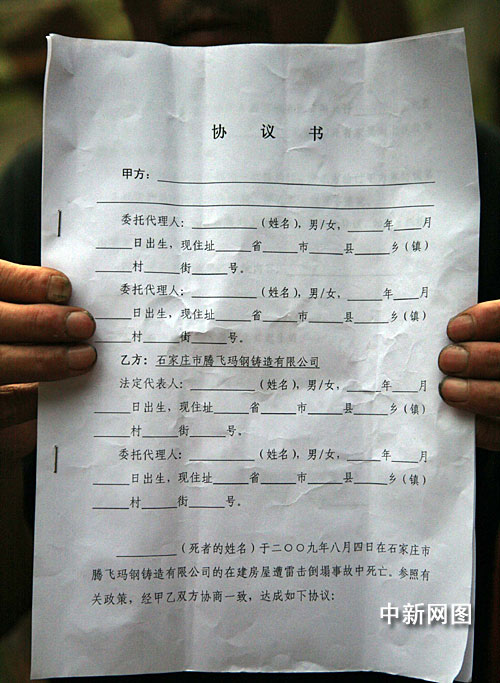 该家属向记者出示了一份空白的“救助”协议书,协议书上的乙方为石家庄腾飞玛钢铸造有限公司。该死者家属说,今天上午10点多,有村委会干部和乡镇干部找到他,要求他签署这份协议书。