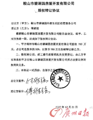 这名网友提供了部分图片证据,从图上能看到,在2007年12月21日签署的鞍山碧湖园房屋开发有限公司股权转让协议上,出让方签名付维强,受让方签名为傅维强。网帖还贴出当地派出所开具的证明,证实付维强在2006年2月21日改名为傅维强。