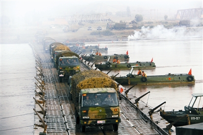 今天(11日)凌晨5时,兰州军区某舟桥团在黄河某渡口架设一座250多米长的浮桥。6时整,由700多辆轮式车辆组成的摩托化部队隆隆驶过。11时,两架搭载兰州军区某师前指和特战分队人员的民航客机,从西北某机场升空向东北某机场飞去。与此同时,两列运载装甲装备、特种装备和工程机械的专列分别在银川、青铜峡火车站整装待发,准备奔向东北大地。至此,“跨越—2009”系列实兵检验性演习拉开序幕。