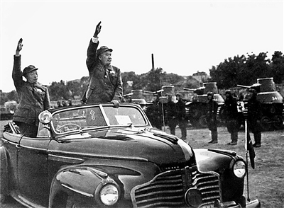 阅兵式开始。朱德身着戎装走下天安门城楼,乘敞篷车通过金水桥。迎候在桥南的聂荣臻致军礼并报告。朱德由聂荣臻同车陪同检阅了受阅部队。
